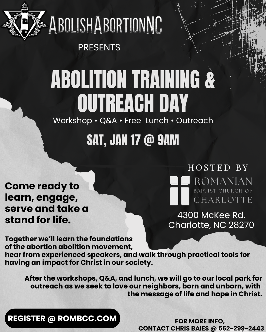Approximatley 46,000 babies are murdured in the state of NC Annually. As the people of God, we cannot remain silent while innocent lives are taken around us. Scripture calls the church to defend the vulnerable and to shine the light of Christ in a culture of darkness. Now is the time for us to stand with courage, speak with compassion and boldness, and act with conviction for the unborn. And not simply to regualte it, but to abolish it. Let us be a faithful witness—proclaiming truth, offering hope, and engaging our community with the love and justice of Christ.